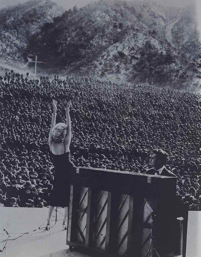 Marilyn était décrite comme timide par nombreux de ses proches. Pourtant un jour de février 1954 en Corée du Sud, elle chante Bye Bye Baby ou Diamonds are Girl’s Best Friend devant plus de 10 000 soldats américains postés à la frontière de la Corée du Nord. Ce moment est immortalisé dans l’œuvre de Russell Young « Marilyn in Korea ». Le mythe s’empare des soldats. Pendant quatre jours, la star fait la tournée des camps pour remonter le moral des hommes en service qui lui vouent dès lors une grande admiration.