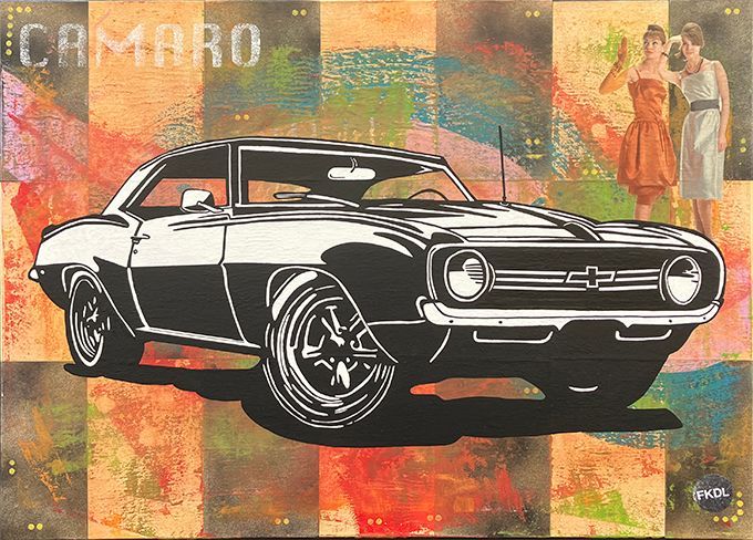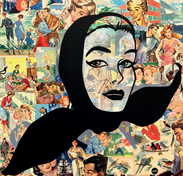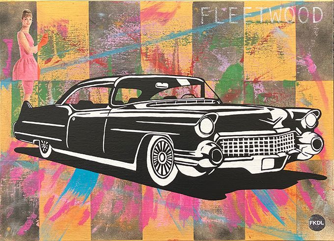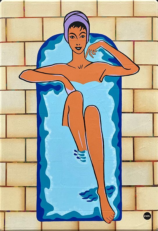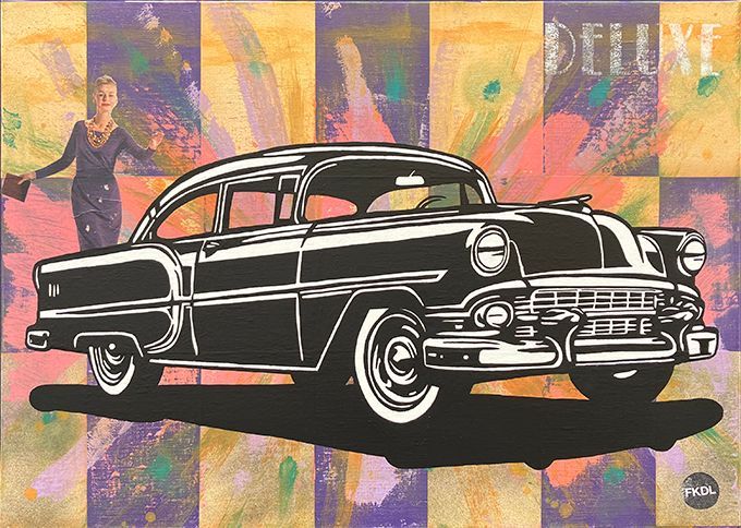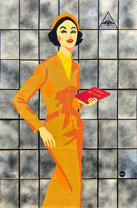 Il fusionne dans sa pratique différents styles artistiques, tels que le collage, la peinture et le dessin. FKDL étoffe ses œuvres d’une iconographie d’époque qu’il exploite comme autant de nuances. Il n’hésite pas à remplacer le pinceau par le papier. Son identité se caractérise par l’utilisation de couleurs vives, de motifs géométriques et de formes abstraites, combinées avec des éléments figuratifs. L’omniprésence des personnages féminins, dans son approche, témoigne d’un engagement féministe assumé et revendiqué pour mettre à l’honneur les femmes dans
