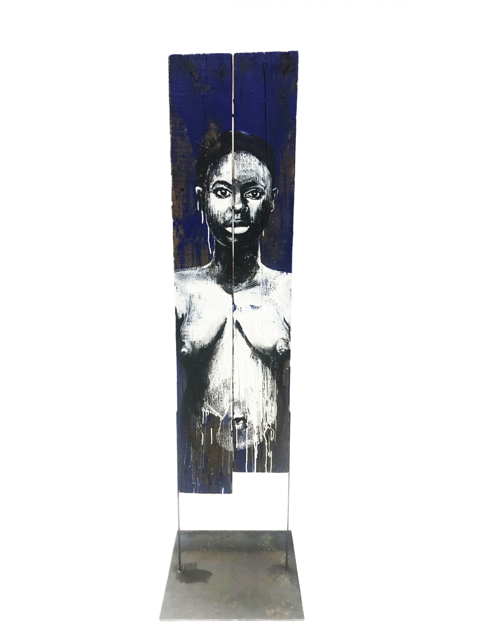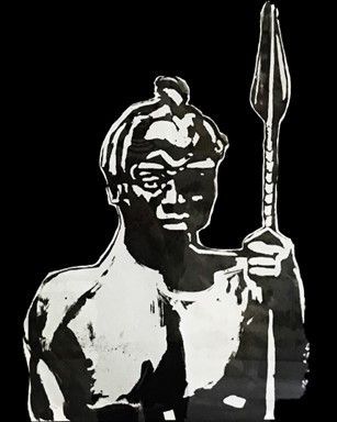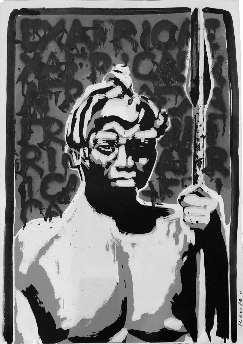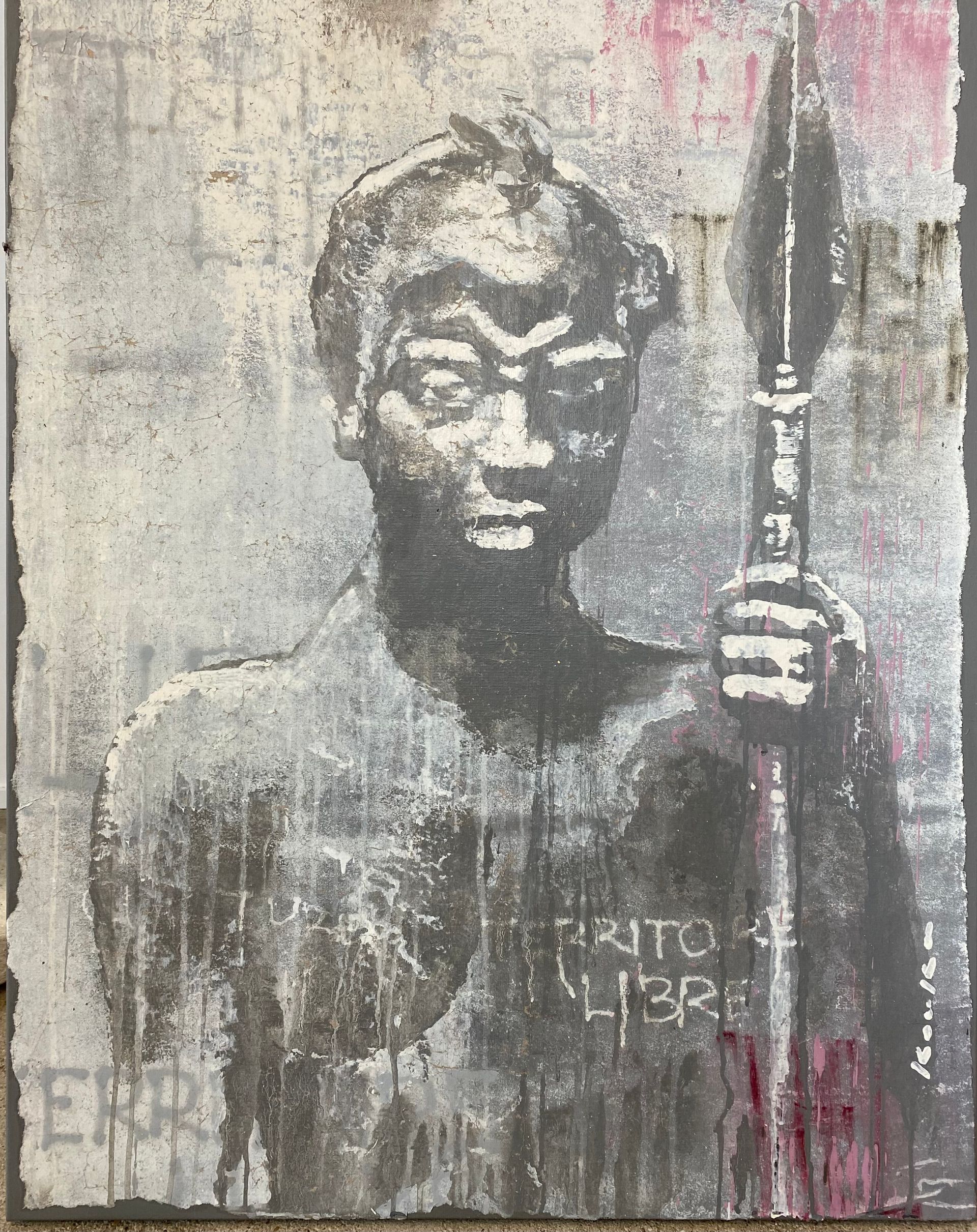 Sa première empreinte urbaine apparaît en 2008 avec la silhouette de guerriers Bantu lors d’un voyage originel à Libreville (Gabon), il prend conscience de l’omniprésence de l’impérialisme occidental établi au sein même des espaces dédiés à la culture en Afrique. Dès lors il décide de revenir aux fondamentaux de cette culture et d’honorer cette Mémoire. L’artiste se met à en peindre des guerriers partout où il voyage : au Congo, en Afrique du Sud, en Belgique, au Maroc, en Grèce, en Russie...