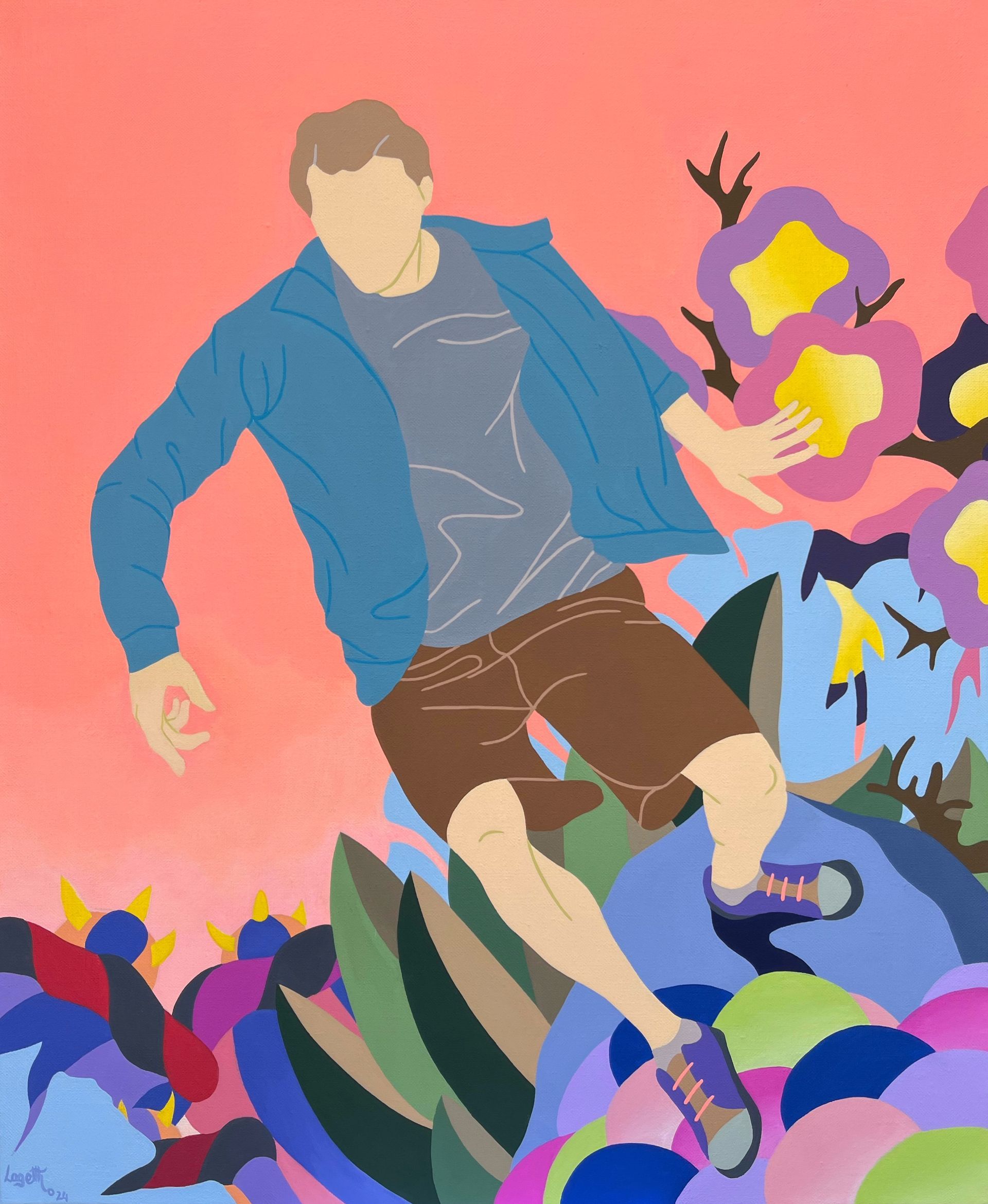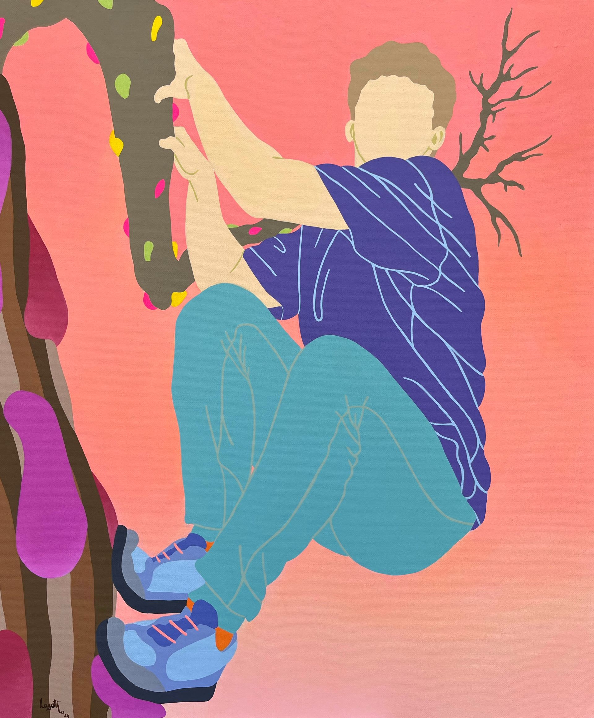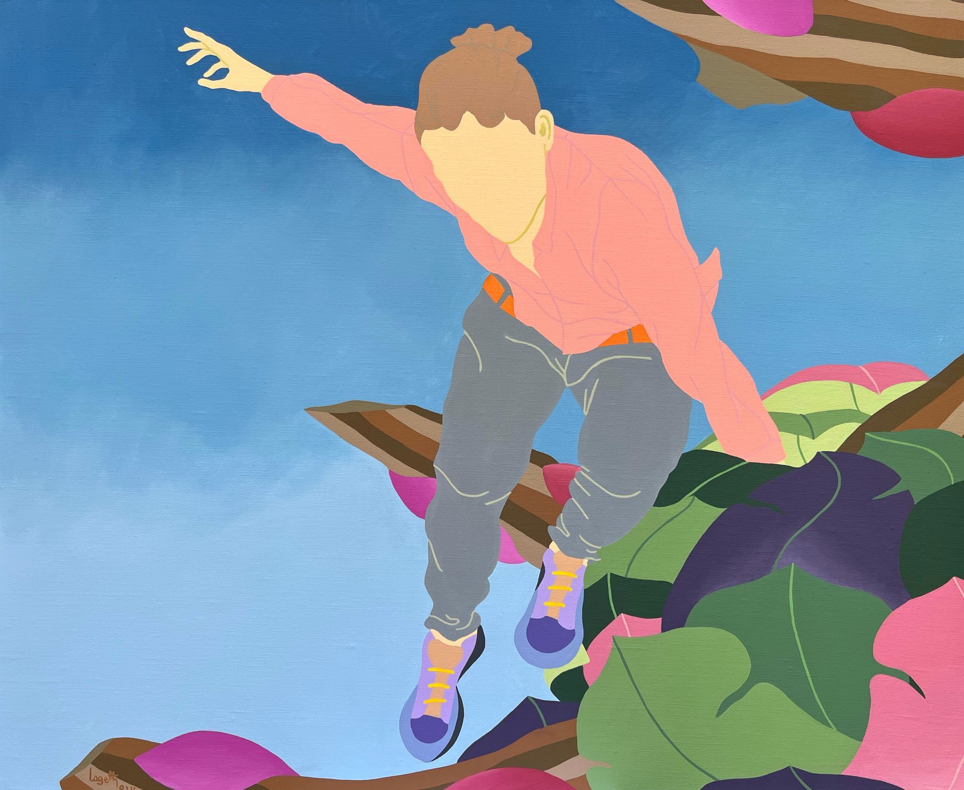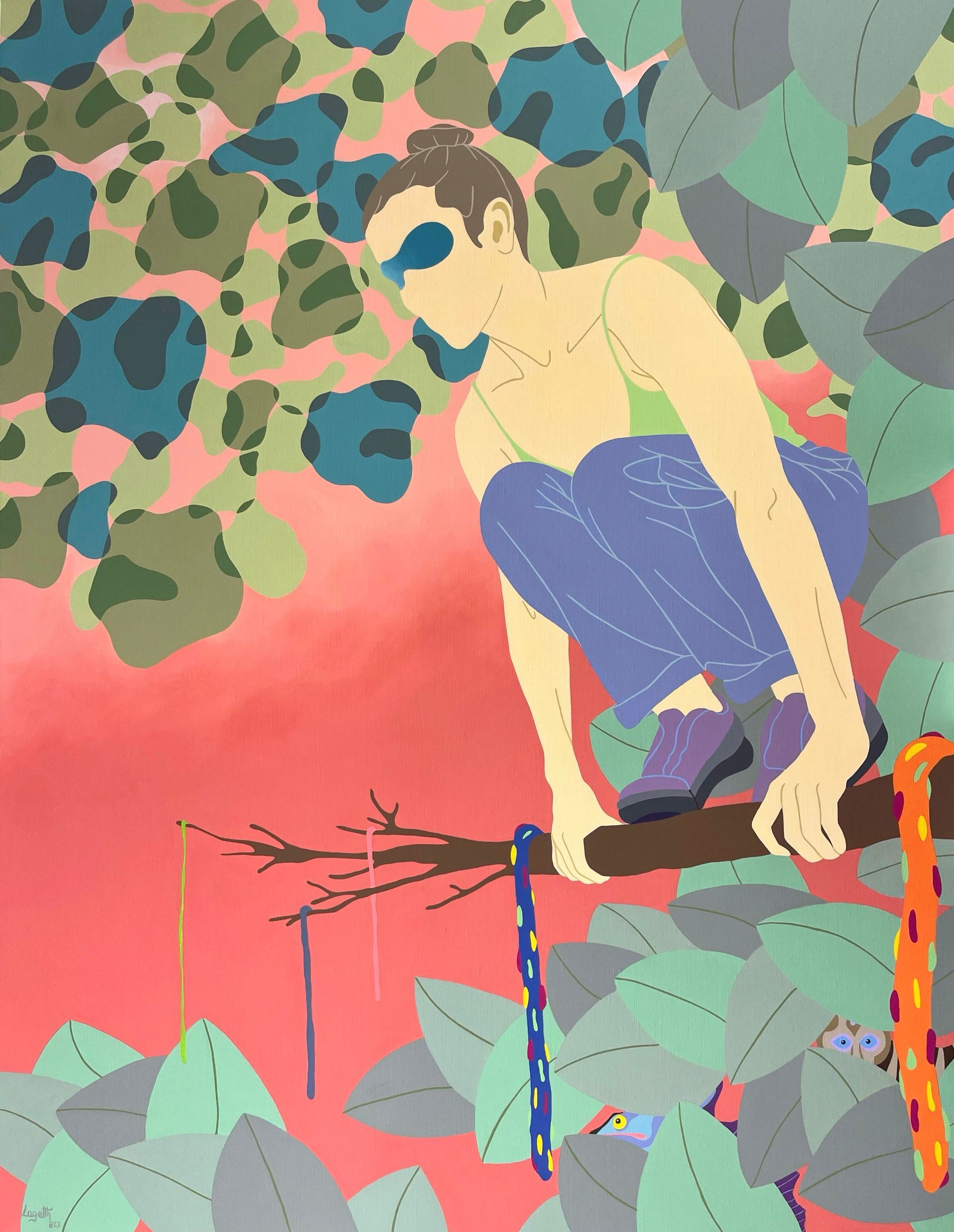 Son travail repose sur un jeu d’ambiguïtés : le rêve d’un ailleurs meilleur se mêle aux contraintes du réel, tandis que ses personnages anonymes, parfois masqués, incarnent cette transformation identitaire qu’implique de se réinventer pour exister ailleurs. Loin d’un témoignage documentaire, Laget-Ro transpose et transfigure des scènes inspirées de réalités existantes à travers son langage pictural fait d’aplats de couleurs, de compositions fragmentées et où la couleur se joue des attendus. Dans son œuvre, le paradis rêvé n’en est pas toujours un…