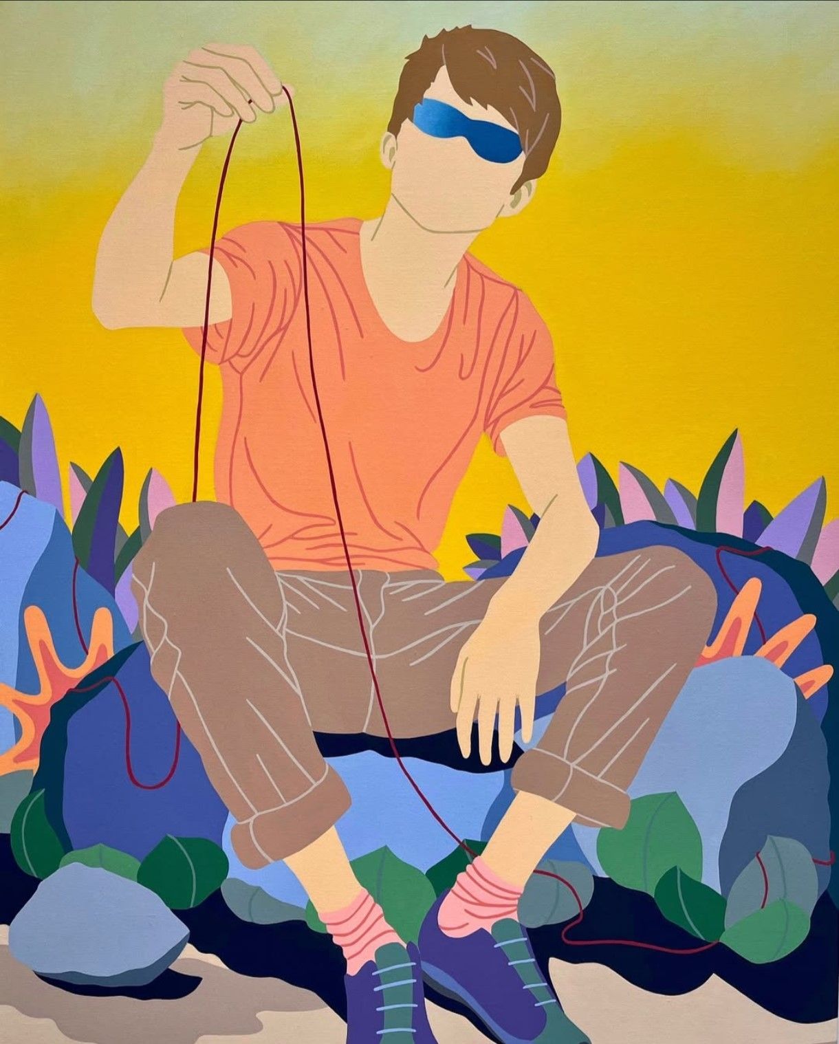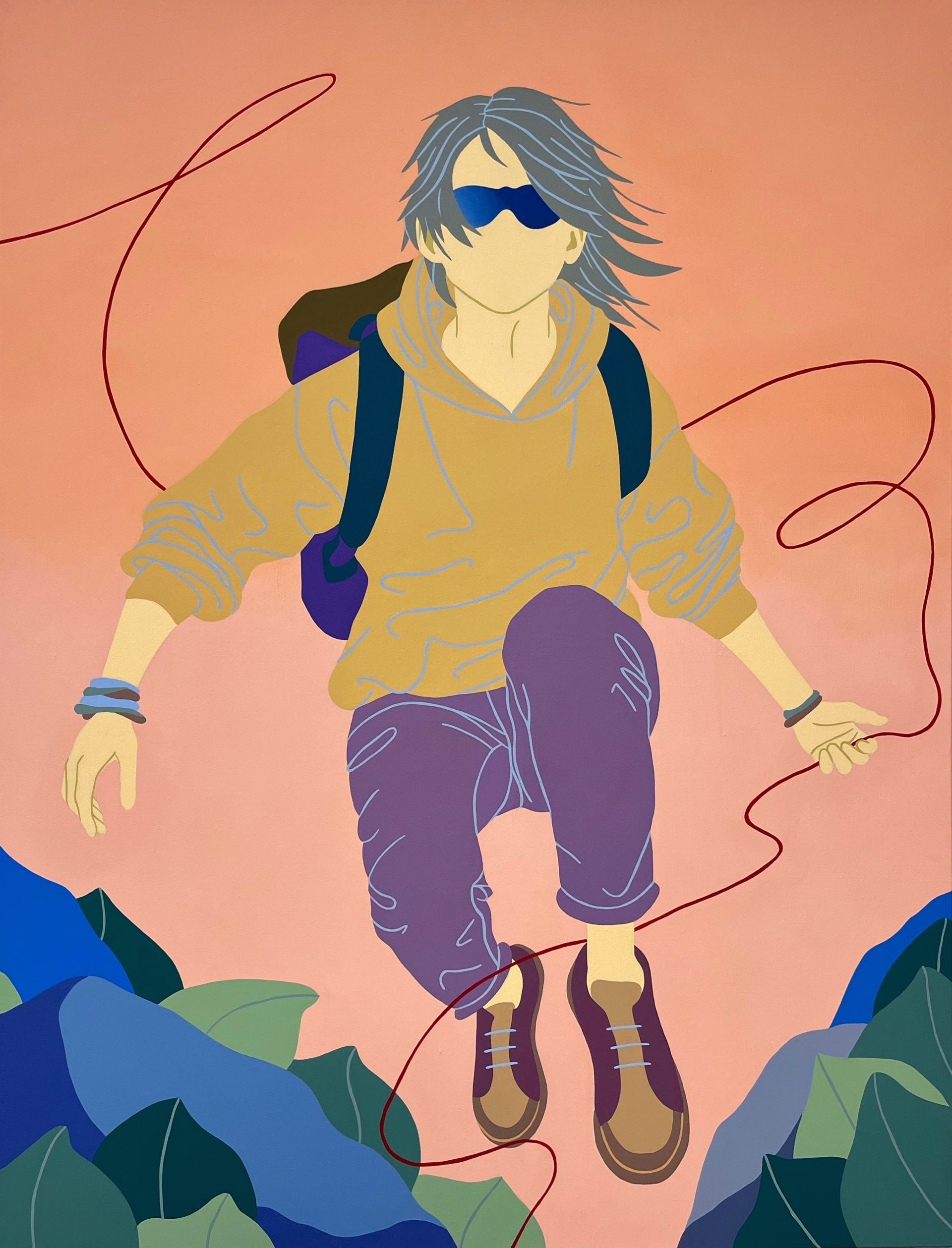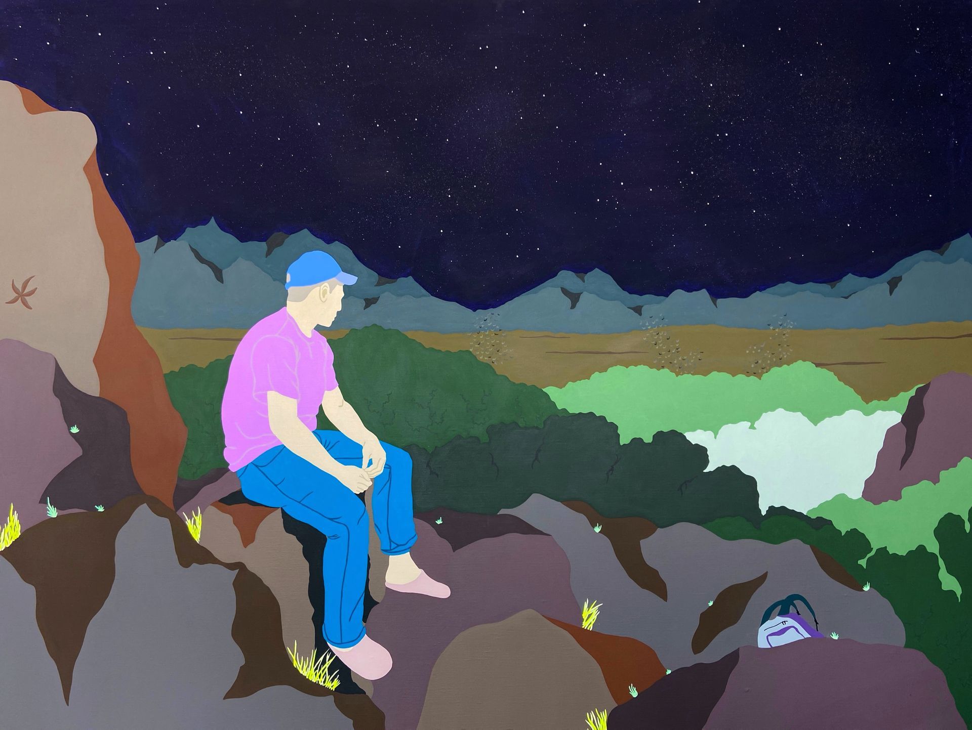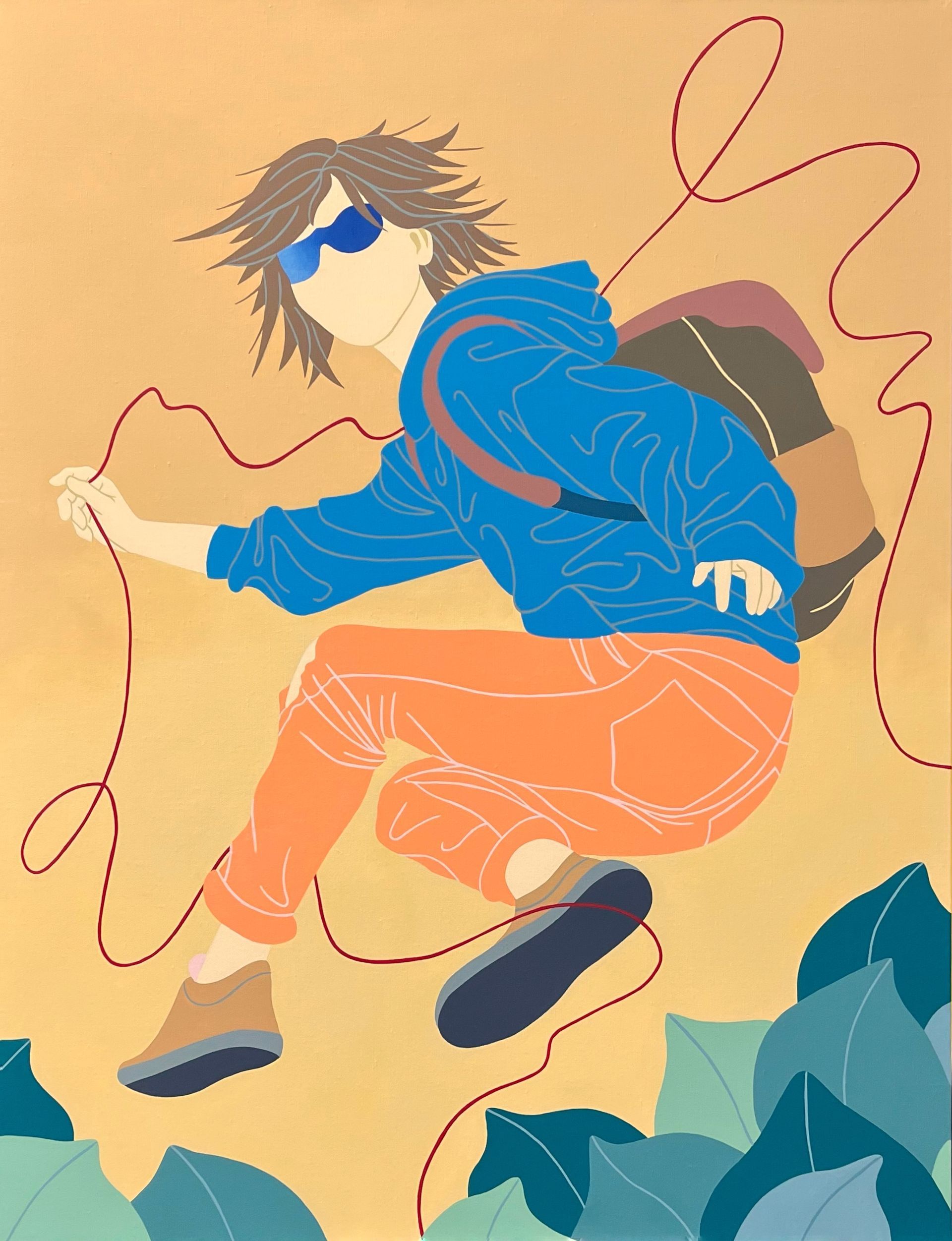 Son travail repose sur un jeu d’ambiguïtés : le rêve d’un ailleurs meilleur se mêle aux contraintes du réel, tandis que ses personnages anonymes, parfois masqués, incarnent cette transformation identitaire qu’implique de se réinventer pour exister ailleurs. Loin d’un témoignage documentaire, Laget-Ro transpose et transfigure des scènes inspirées de réalités existantes à travers son langage pictural fait d’aplats de couleurs, de compositions fragmentées et où la couleur se joue des attendus. Dans son œuvre, le paradis rêvé n’en est pas toujours un…