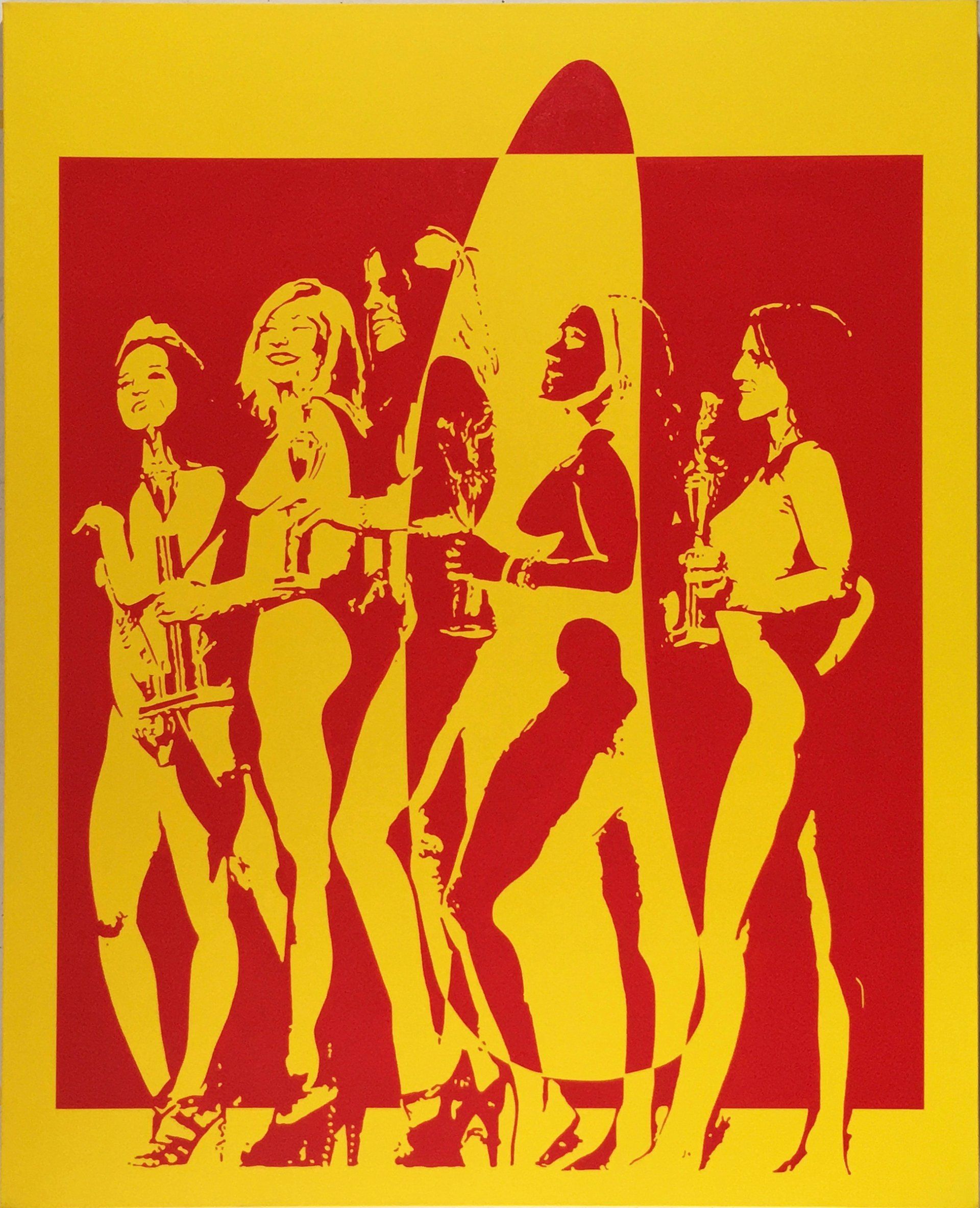 L’artiste se joue également de l’imagerie populaire à l’instar de ses pairs américains pop artistes, l’aplat de couleur qui sert les représentations de femmes idéales, incarnations de canons esthétiques impeccables cultive l’ambivalence du côté lisse de la femme parfaite conjugué à l’absurdité d’une représentation désuète.