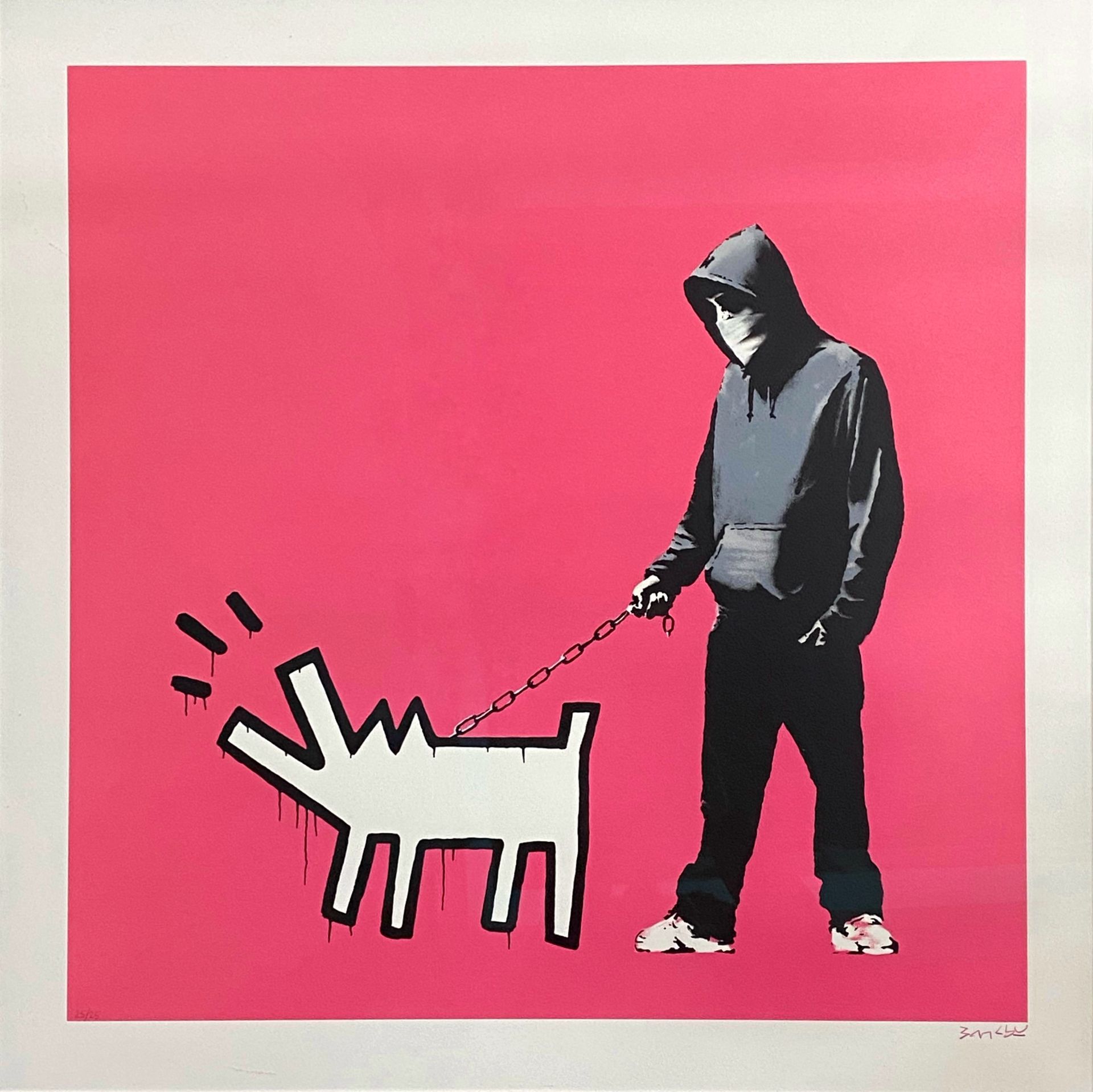 Dans son œuvre emblématique Choose Your Weapon, il juxtapose une silhouette urbaine anonyme au Barking Dog de Haring.