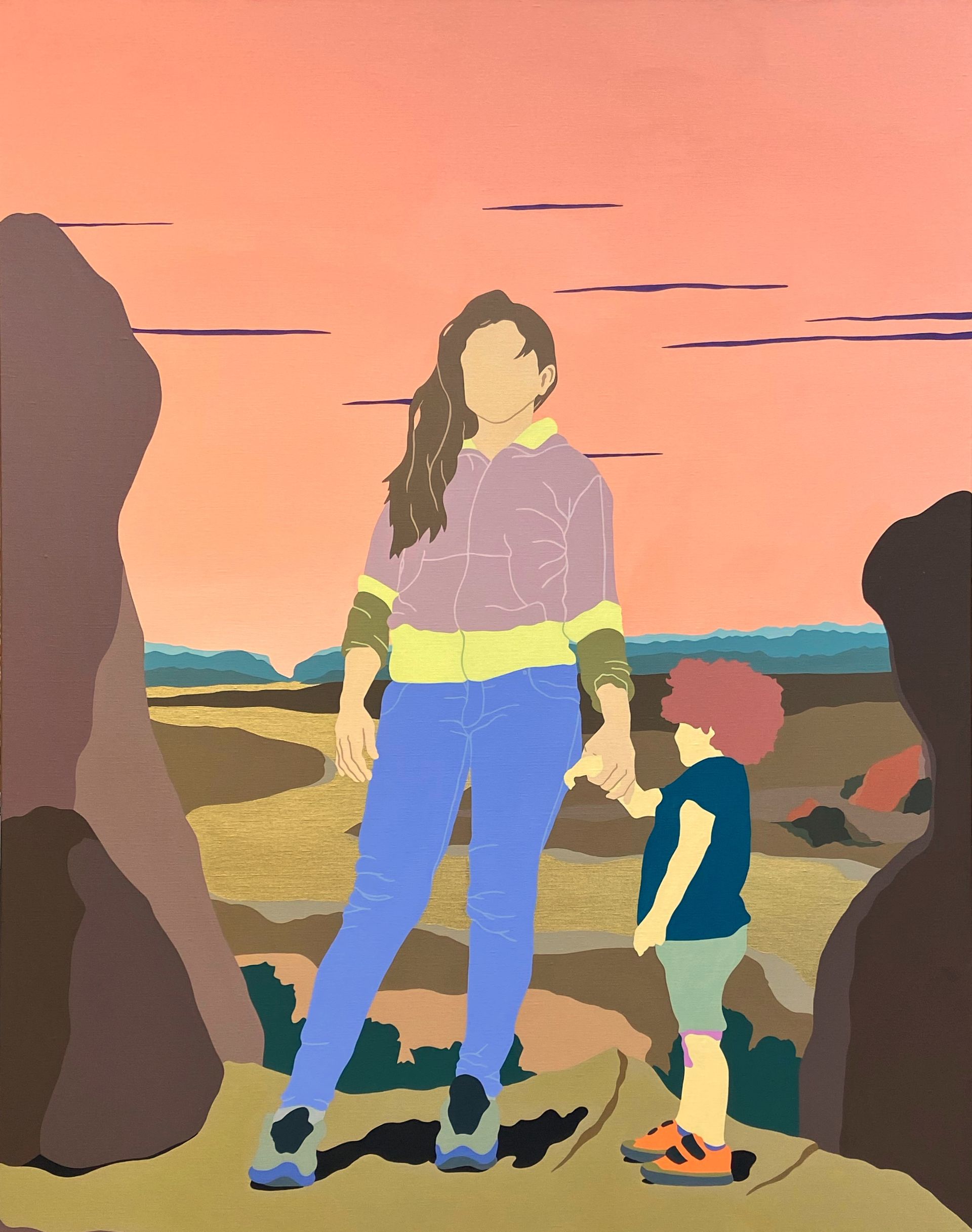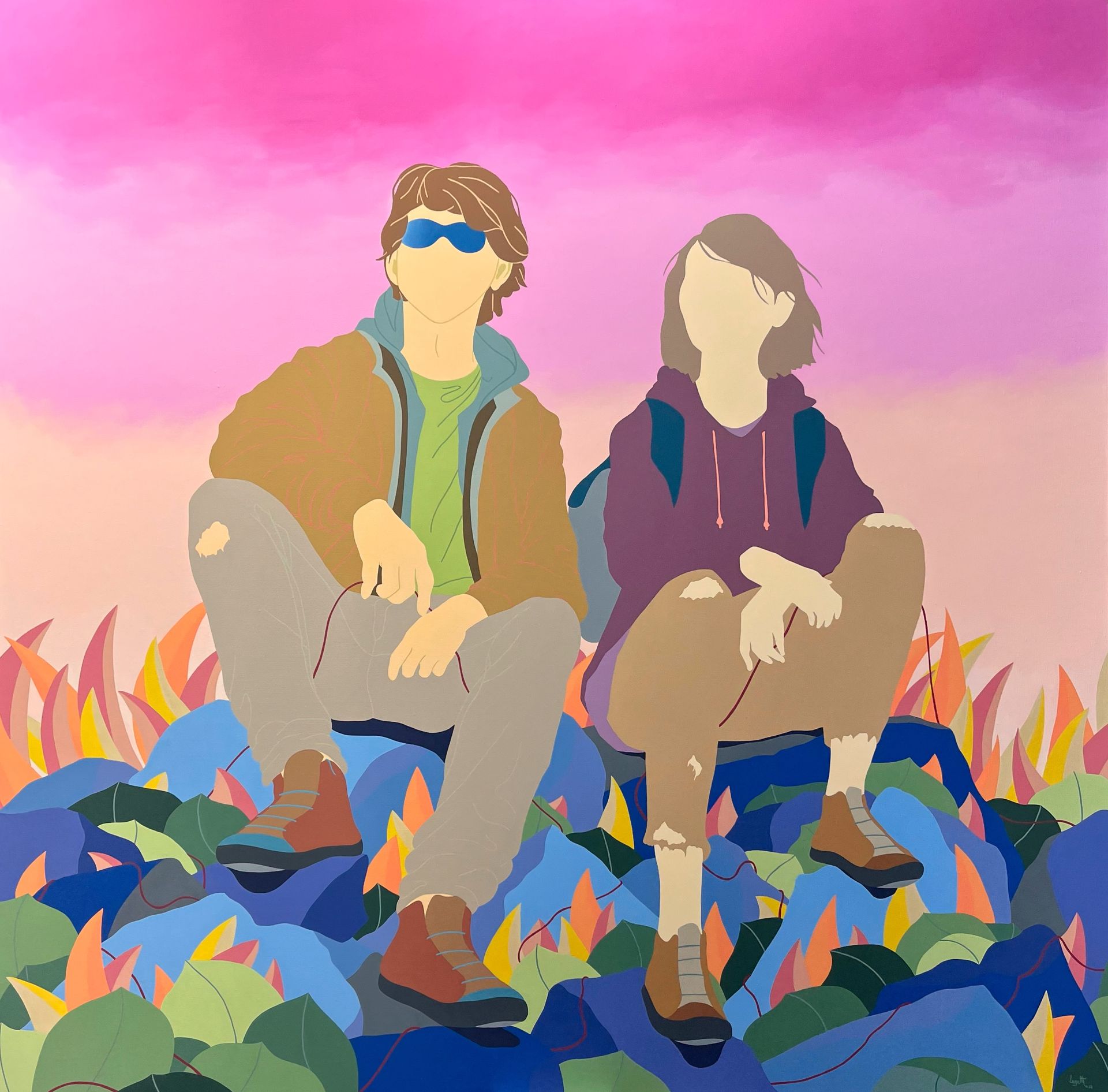 Son travail repose sur un jeu d’ambiguïtés : le rêve d’un ailleurs meilleur se mêle aux contraintes du réel, tandis que ses personnages anonymes, parfois masqués, incarnent cette transformation identitaire qu’implique de se réinventer pour exister ailleurs. Loin d’un témoignage documentaire, Laget-Ro transpose et transfigure des scènes inspirées de réalités existantes à travers son langage pictural fait d’aplats de couleurs, de compositions fragmentées et où la couleur se joue des attendus. Dans son œuvre, le paradis rêvé n’en est pas toujours un…